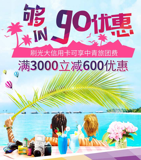 使用光大银行信用卡通过中青旅遨游旅行指定渠道(含门店、PC、WAP及APP等但不限于)全额支付指定旅游路线的团费,即有机会享满3000元及以上立减600元的优惠。活动限5000个名额。