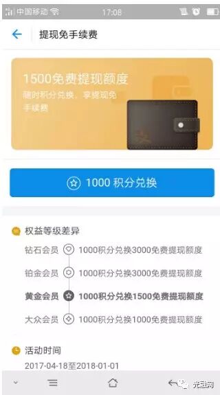 因为小编是黄金会员,所以1000积分只能兑换1500的免费提现额度,我总共有6000多分,所以,这个只能解决短期问题,不过要是你经常买买买,积分涨得也快,也是可以的。