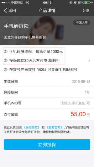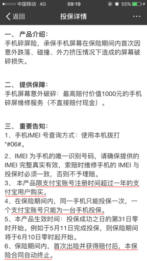 支付宝碎屏险的售价为55元/年,而最高维修费用为1000元。购买方式也相对简单,要直接在支付宝APP下单购买,并不需要到线下验机。此外,支付宝要求投保30天后才能申请理赔,而提供理赔维修服务的是中国人寿签约的手机维修点。