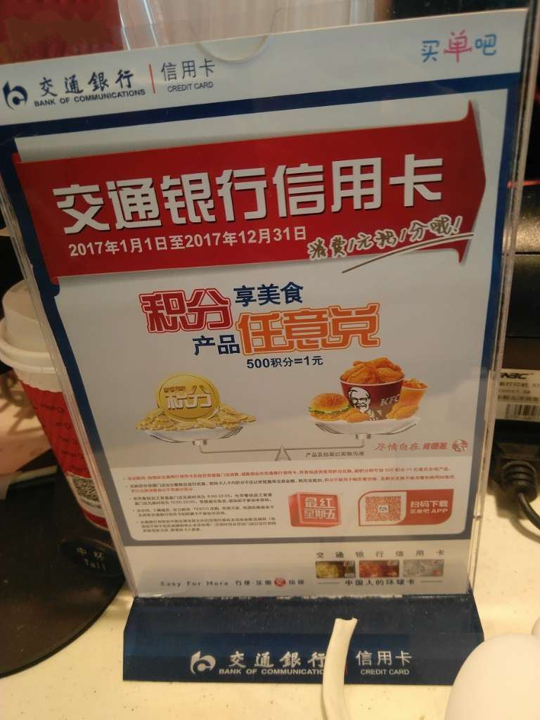 第一种姿势是直接在肯德基店内刷卡消费交行积分抵扣(务必告知店员是要用交行积分兑换),比例为每500积分抵扣1元,但不能和KFC优惠券同时使用,实惠效果大打折扣。因而本文主要推荐第二种姿势~~