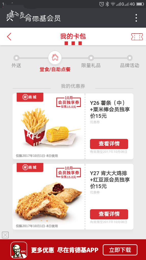 而后,你需要注册一个肯德基WOW会员,结账时首先让店员扫一下肯德基微信公众号菜单中的“WOW会员”->“会员码|1元积100K金”中的会员码(这样可以获取KFC会员积分),而后点击“WOW会员”->“我的卡包|会员独享价”查看选用KFC会员优惠券,点击“查看详情”让店员扫优惠码,譬如目前价值27元的肯大大鸡排+红豆派会员独享价只要15元,再搭配一下凑到交行支付优惠券金额进行买单,买单时出示买单吧APP中的餐饮券二维码就大功告成了。